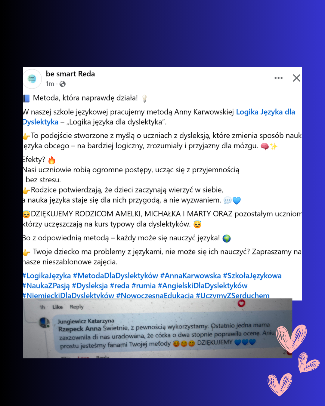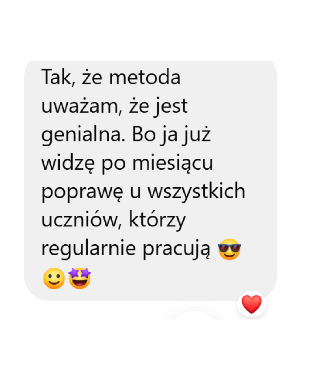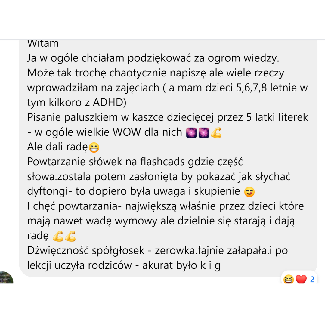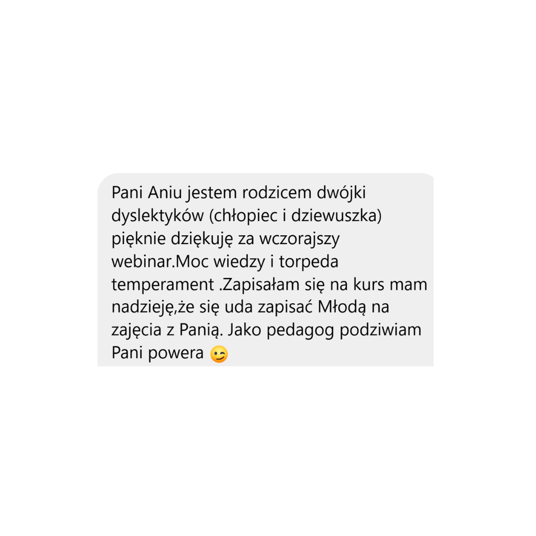 Najlepsze kursy tylko u Ani, krok po kroku wyjaśnione jak pracować. Uważam, że bardzo pomocne i to nie tylko przy pracy z dyslektykami. To takie KNOW HOW dla każdego nauczyciela. Same konkrety– proste strategie, które można natychmiast wdrożyć. Dzięki kursowi zyskałam nie tylko nowe narzędzia, ale też większą pewność, że to, co robię, ma sens i realnie pomaga dzieciom. Polecam każdemu nauczycielowi, który chce skutecznie wspierać uczniów i ich rodziców. - Ania właścicielka kameralnej szkoły językowej LangHatLab
