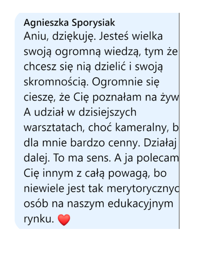 "Aniu, marzę o edukacji pełnej osób, które mają takie podejście do nauczania. Posiadasz ogromną wiedzę i wiesz, jak ją wykorzystać. Szukasz, eksplorujesz i wdrażasz skuteczne rozwiązania. Cieszę się, że świat online pozwolił mi nawiązać z Tobą kontakt. ❤